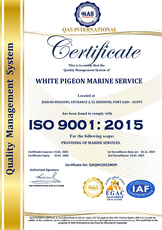 White Pigeon Marine Services has been a leading provider of marine supplies and services since its establishment in 2012. Headquartered in Port Said, Egypt, we have expanded our reach to cover all major Egyptian ports, offering comprehensive solutions for marine operations. With a branch in Greece, we are strategically positioned to serve clients across the Mediterranean and beyond, Our commitment to excellence and customer satisfaction has made us a trusted partner in the marine industry.